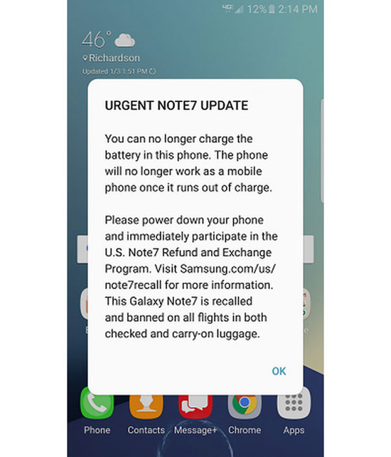 Samsung has issued a update for Galaxy Note 7, which renders the device unusable. Update force received from the owners of explosive gadgets in the USA.